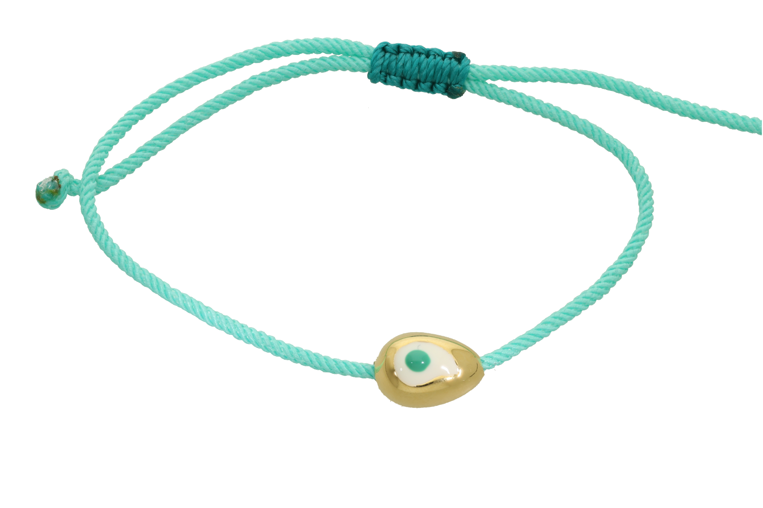 Βραχιόλι σε μπρούντζο επίχρυσο, Πασχαλινό Αυγό, γυαλιστερό μίνι με μάτι από λευκό και μπλε σμάλτο και κορδόνι.