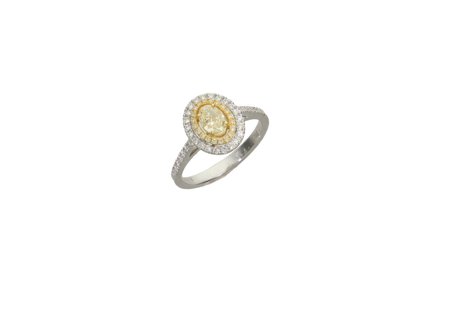 Δαχτυλίδι ροζέτα σε λευκόχρυσο 18Κ με δύο σειρές από διαμάντια και κίτρινο διαμάντι στο κέντρο
