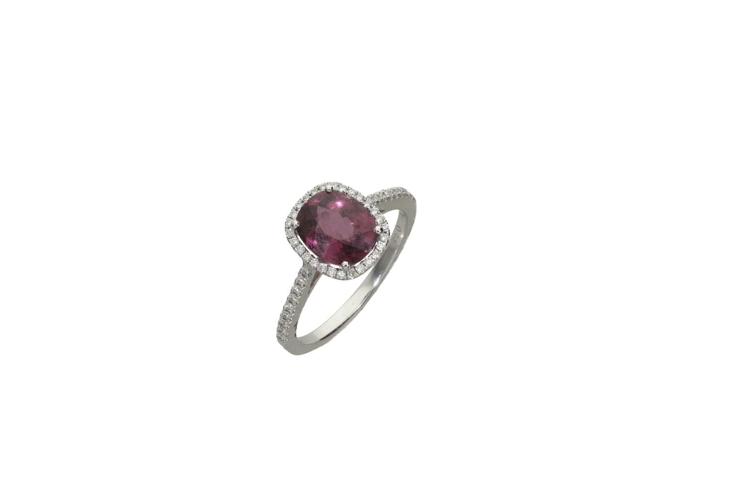 Ring in 18K white gold with cushion-cut rhodolite and diamonds on the perimeter