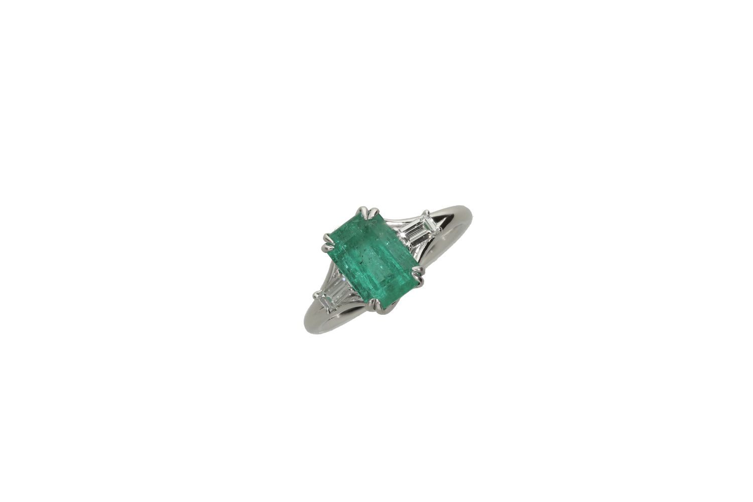 18K white gold rectangular emerald ring with two baguette-shaped diamonds.