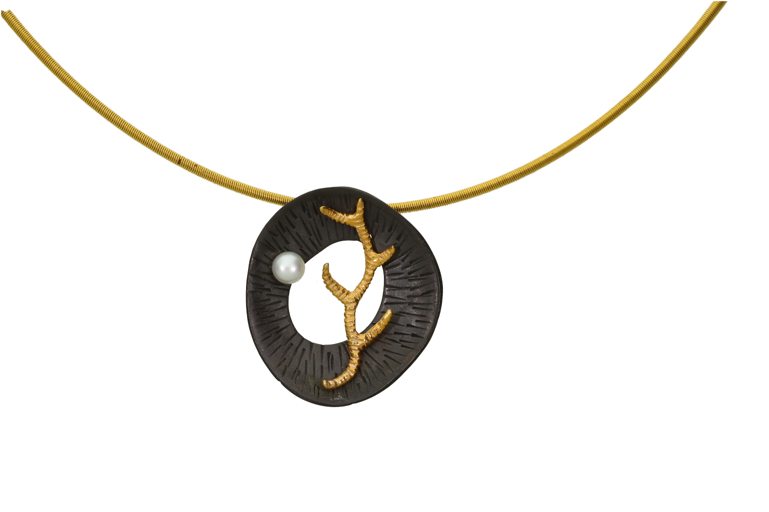 Necklace in two-tone silver 925° blackened circular motif with gold-plated branch and a pearl