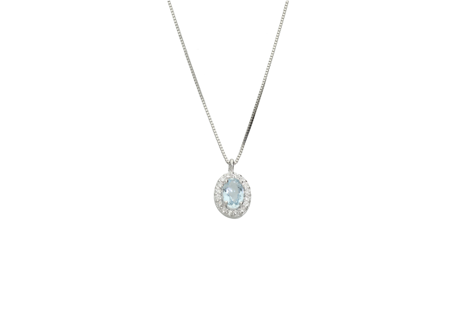 Necklace in 18K white gold oval rosette with Diamonds and aquamarine with Venetian chain.