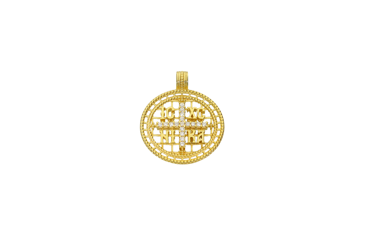 Constantinato in 14K Gold Round Pierced ICXC NIKA Zircon Cross Embossed