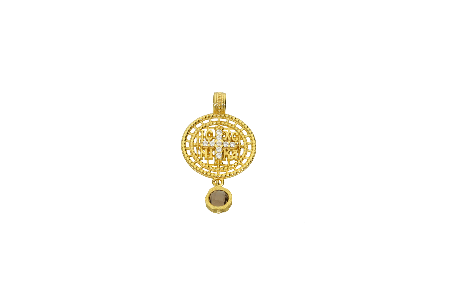 Constantinato in 14K gold round pierced with ICXCNIKA cross-shaped zircon and a pendant zircon