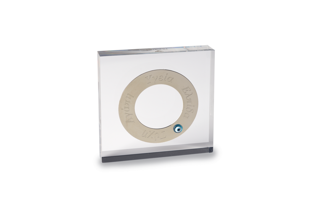 Πρες Παπιέ - Διακοσμητικό γούρι με κύκλο ευχών - Τύχη, Ελπίδα, Υγεία, Αγάποη και ματόχαντρο πάνω σε διάφανο πλέξι γκλας