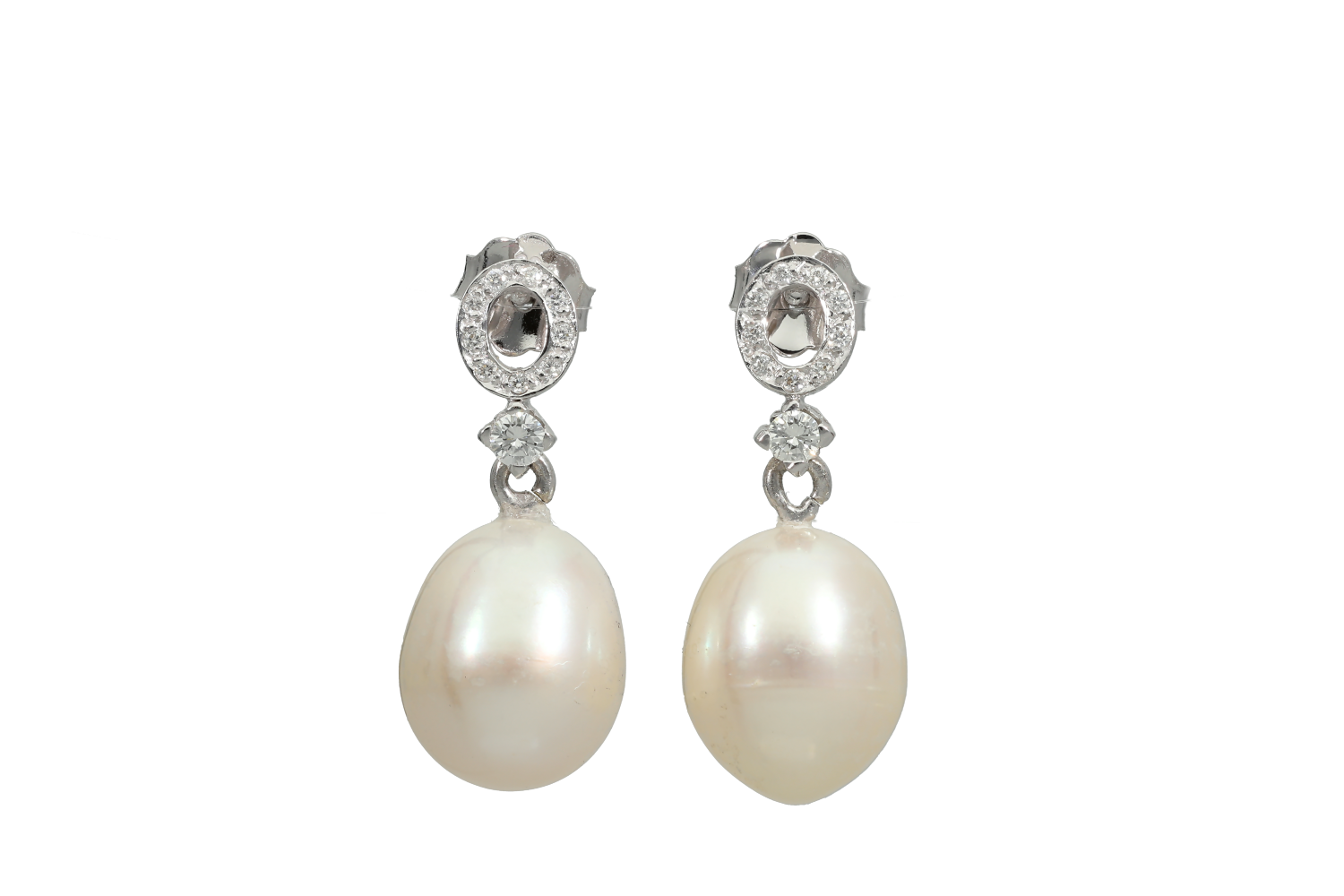 Σκουλαρίκια σε λευκόχρυσο 18Κ με ένα οβάλ καστόνι με διαμάντια που από κάτω του έχει ένα μονοπετράκι και τελειώνει σε ένα μαργαριτάρι σε σχήμα σταγόνας