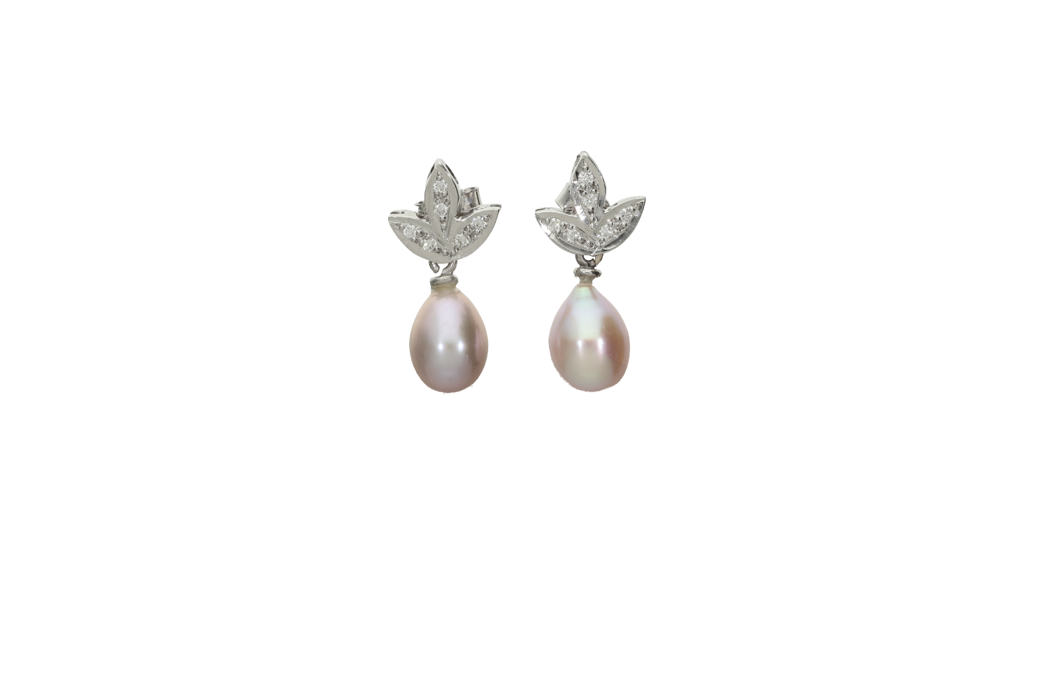 Σκουλαρίκια σε λευκόχρυσο 18Κ τριπλό φυλλαράκι με διαμάντια και κρεμαστά Μαργαριτάρια ροζ γλυκού νερού σε σχήμα σταγόνας.