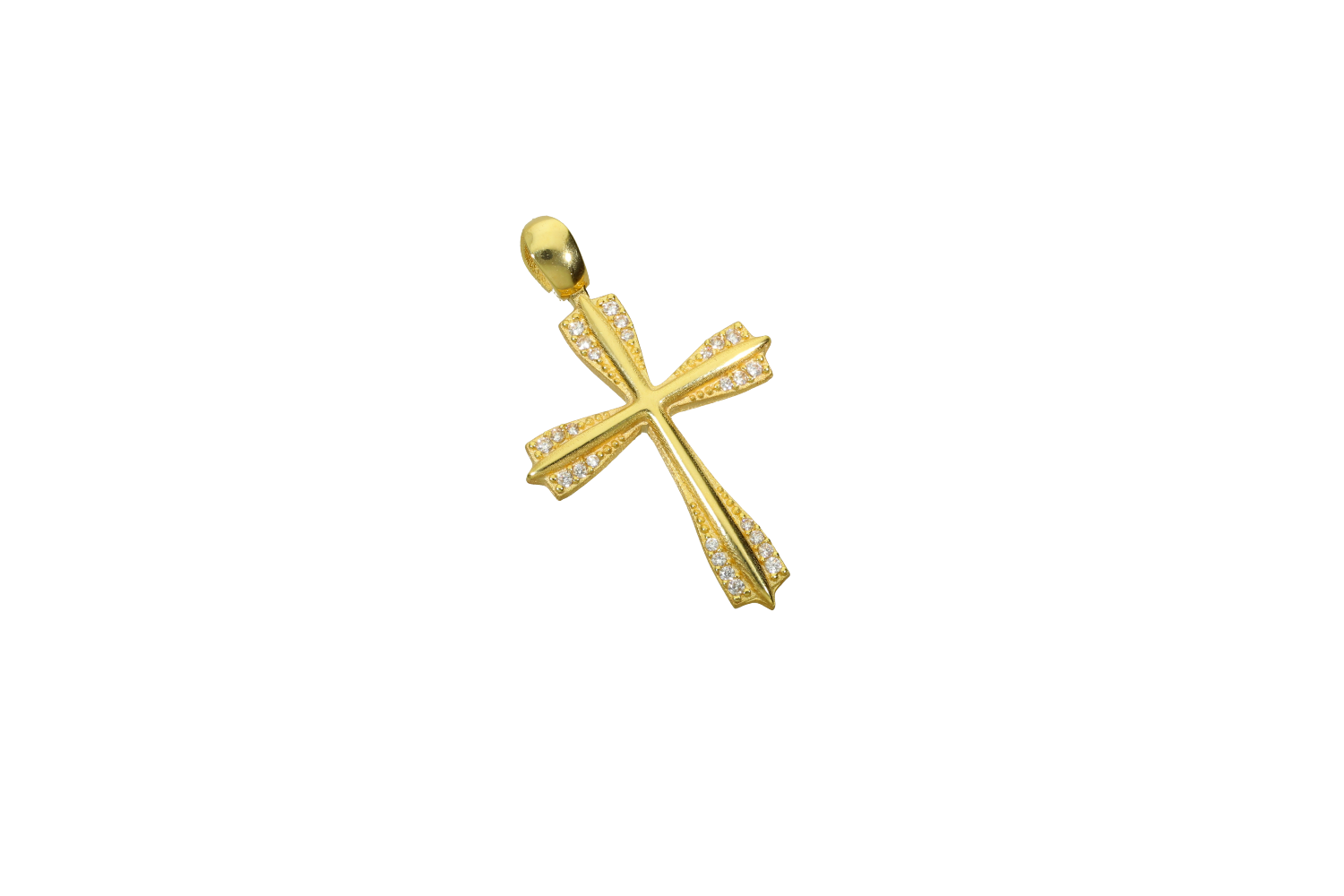 Σταυρός Βάπτισης για κορίτσι σε χρυσό 9Κ με τριγωνικές άκρες πρόσθετο λεπτό λουστρέ σταυρό και ζιργκόν